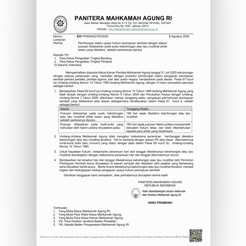 - Perhitungan Waktu Permohonan PK Karena Putusan Didasarkan Suatu kebohongan Atau tipu muslihat (11 Agustus 2025) www.dandapala.com. Link: https://www.dandapala.com/article/detail/perhitungan-waktu-permohonan-pk-karena-putusan-didasarkan-suatu-kebohongan-atau-tipu-muslihat (Diakses: 15 Agustus 2025).
